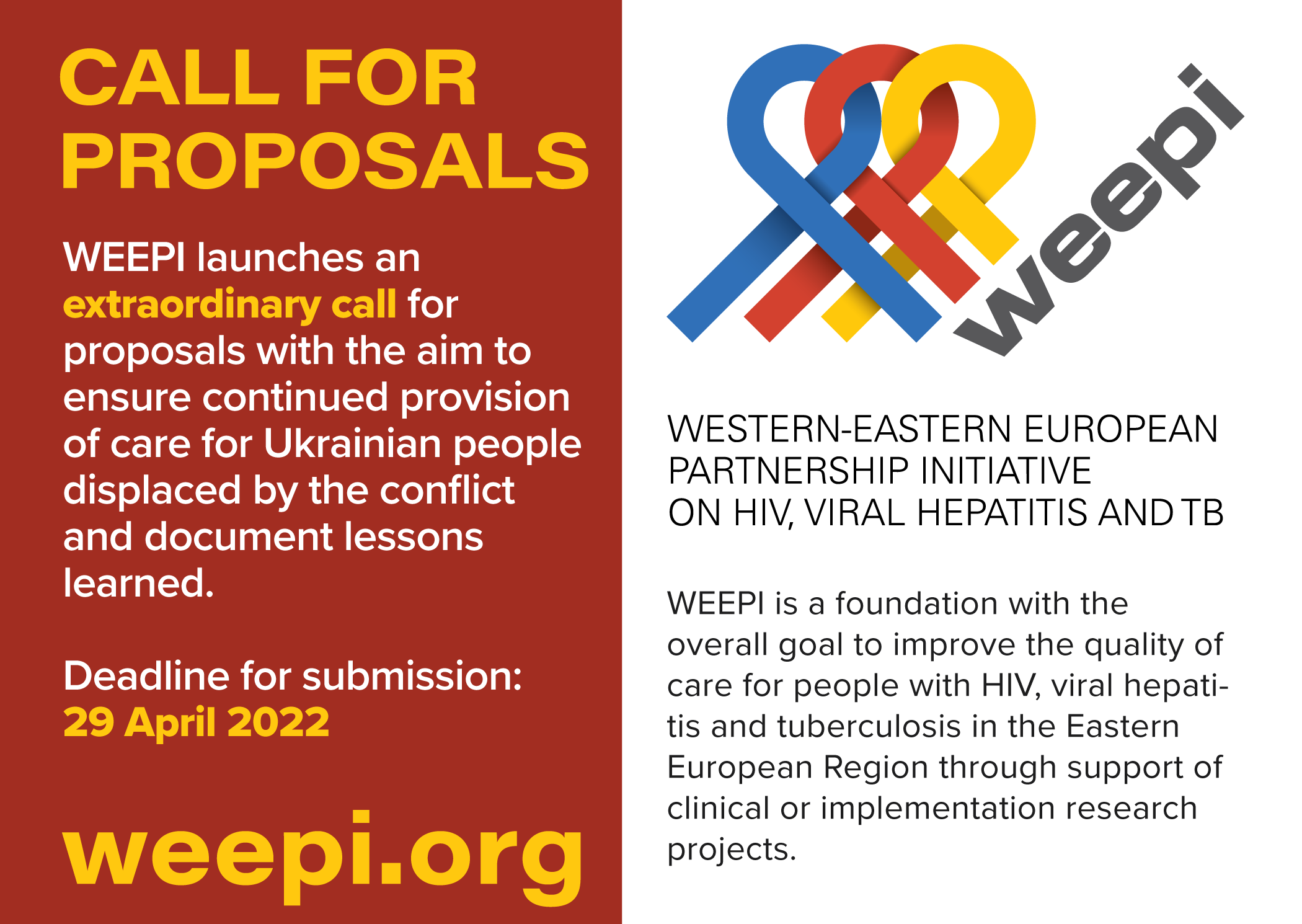 The WEEPI Foundation is launching an extraordinatory call for proposals to support projects that focus on developing and documenting good practices for the provision of HIV, viral hepatitis or tuberculosis related care for people affected by the conflict in Ukraine. Proposals from the following countries are eligible: Hungary, Republic of Moldova, Poland, Romania, Czech Republic, Slovakia and Ukraine.