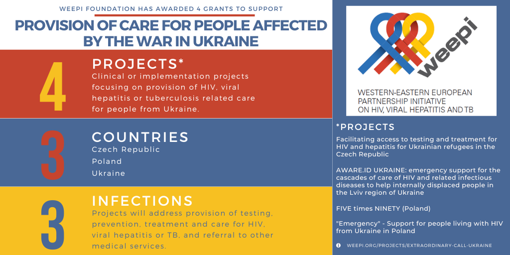 Four projects were selected following the WEEPI Foundation’s ‘extraordinary’ call for emergency projects to support the provision of HIV, viral hepatitis and tuberculosis care for people affected by the war in Ukraine. In addition to the general evaluation criteria (available here), the ability to document generalizable lessons learned for the provision of care in similar emergency situations was a core criterium in the selection process.